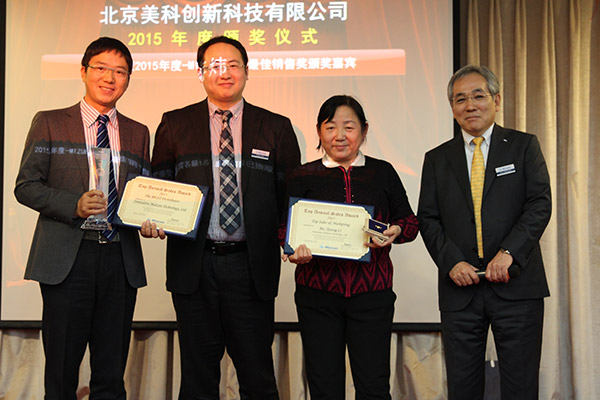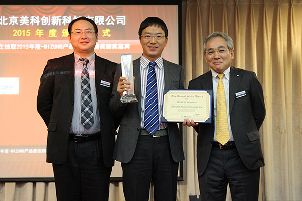 2015年,MIZUHO Medical系列产品在全球核心市场表现优异。而北京710公海创新科技有限公司作为MIZUHO Medical在中国地区神经外科领域的总代理商,在2015年更以强劲销售额增长率,使中国一举成为15年度MIZUHO全球增长最快的市场。为此,2016年1月25日TONY Murouchi,MIZUHO Medical神经外科及骨科产品全球销售总监,及大中华区姚佳伟经理,特意飞至北京,借北京710公海创新公司年度会议时,将“MIZUHO全球增长最快市场”大奖颁给了由蒋炜领导的北京710公海创新公司。同时,TONY还特别颁发了“特别贡献奖”给到710公海华中区的大区销售经理李玉蓉女士,特别感谢她以及团队成员在15年所取得的佳绩。为此,TONY还特别在日本制作了一枚金动脉瘤夹作为奖励授予了李玉蓉经理。